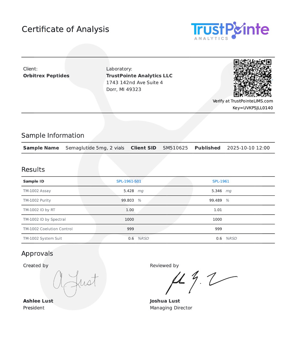 Comparison to Tirzepatide (Dual Agonists): While functionally related, newer compounds like Tirzepatide act as dual-agonists, targeting both the GLP-1 and GIP (glucose-dependent insulinotropic polypeptide) receptors simultaneously. This dual action often results in even faster total adipose reduction. Conversely, 1G-SGT 5mg is generally utilized in research focused strictly on pure GLP-1 pathway mapping and researchers seeking the most robust, historically proven safety data.