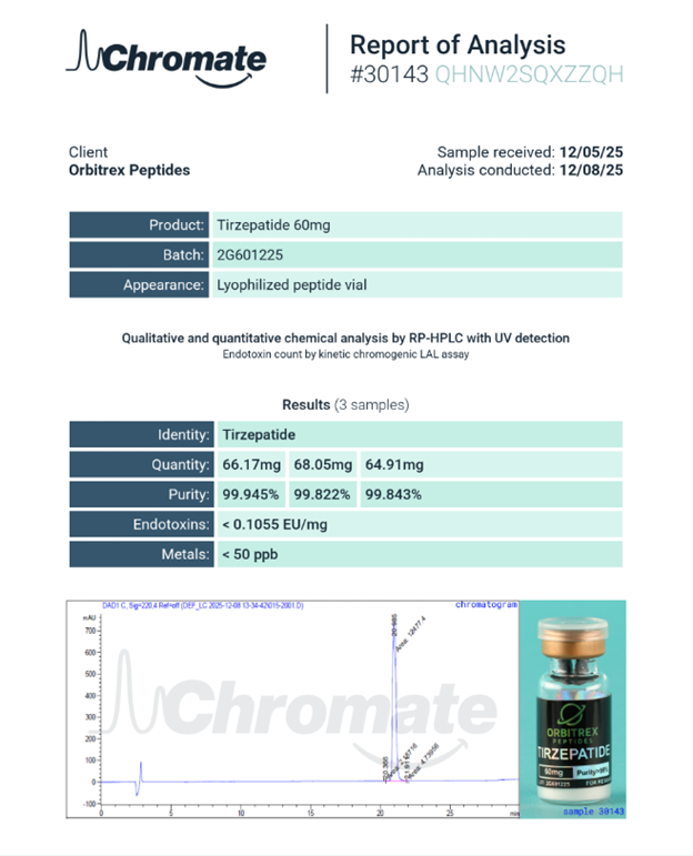 We mandate strictly >99% purity for the 2G-TZ 60mg Peptide, ensuring your laboratory receives uncompromised materials entirely free from binders, heavy metals, synthetic impurities, or leftover manufacturing byproducts. When you source your complex metabolic materials from Orbitrex, you are sourcing absolute, verifiable reliability.