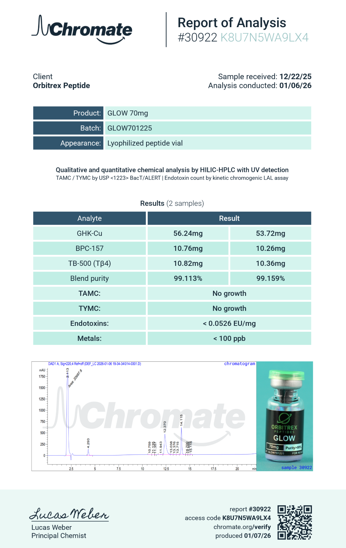 We mandate strictly >99% purity for the GLOW 70 Peptide Blend, ensuring your laboratory receives uncompromised materials entirely free from binders, heavy metals, synthetic impurities, or manufacturing byproducts. When you source your materials from Orbitrex, you are sourcing reliability.