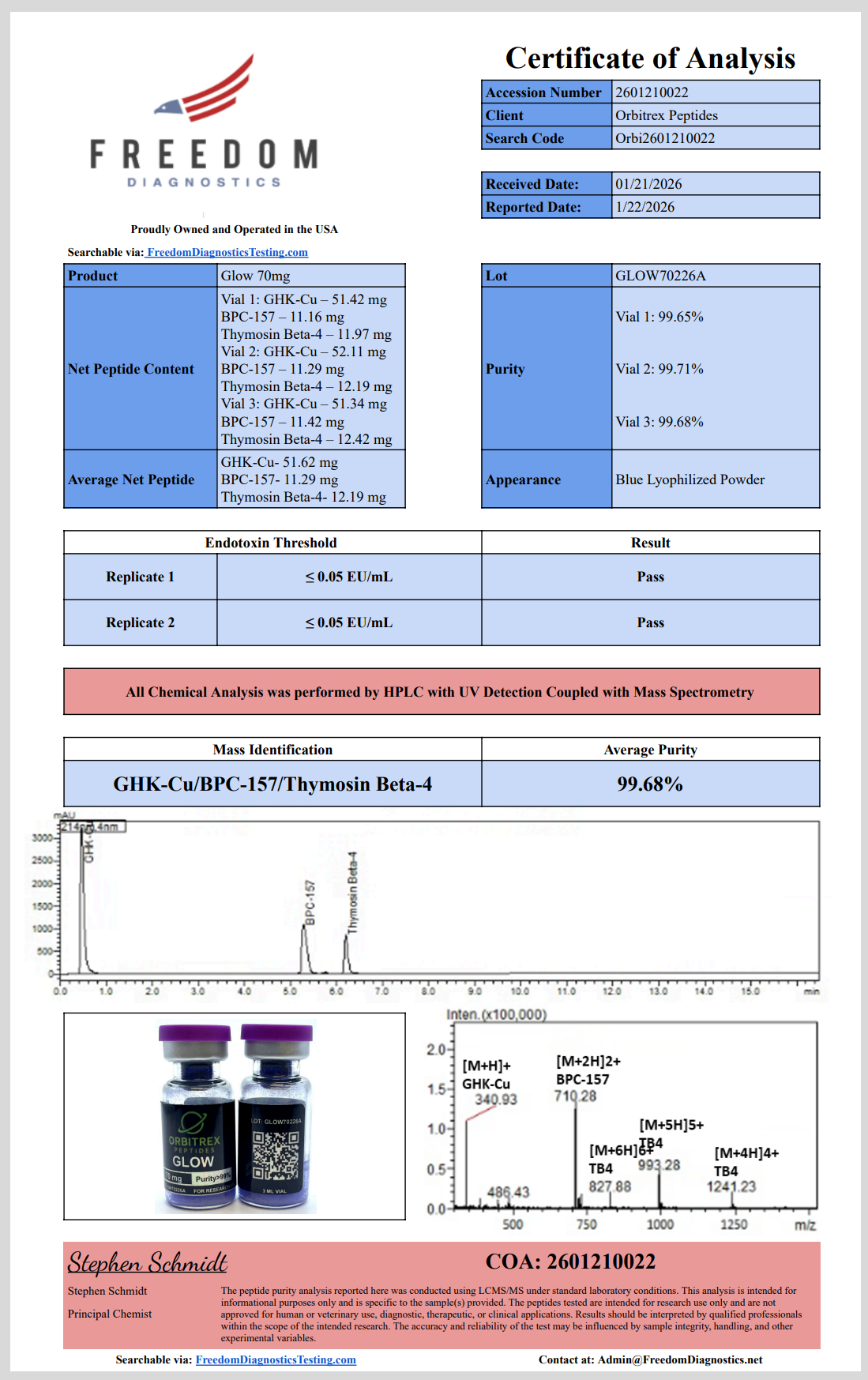This is why we guarantee that every single batch of our GLOW 70 Peptide Blend undergoes rigorous, independent third-party testing before it is ever cleared for distribution to the scientific community.